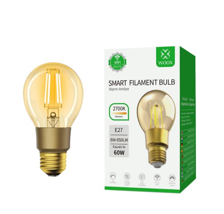 A lâmpada LED de filamento inteligente WOOX 9078 foi criada para trazer iluminação clássica, vintage e romântica para sua casa, escritório, restaurante ou outro ambiente onde este tipo de luz de coloração âmbar quente é desejada. A iluminação clássica com um toque de controle inteligente trazida pela WOOX Home. Você pode conectar o WOOX R9078 ao seu router WiFi em casa sem a necessidade de um hub ou outro serviço. Assim que o R9078 estiver conectado ao aplicativo gratuito WOOX Home em seu dispositivo Android ou iOS, você poderá controlar o R9078 de qualquer lugar, a qualquer hora. Você pode definir horários, criar cenas no aplicativo, conectar o R9078 com outros dispositivos WOOX através do mesmo aplicativo e ainda pode controlá-lo por serviços de controle de voz como Amazon Alexa e Google Assistant.