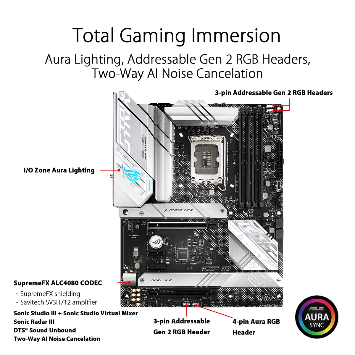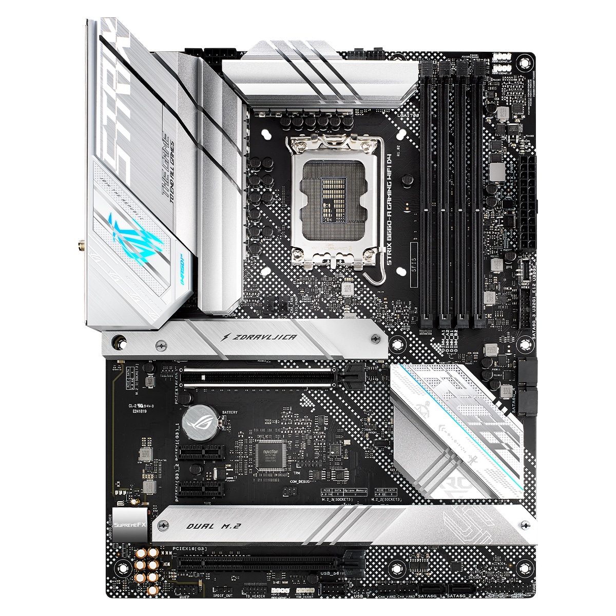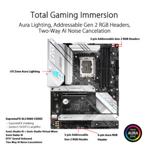 A ROG Strix B660-A Gaming WiFi D4 vai virar cabeças com um acabamento branco prateado impressionante que contrasta com um ousado logótipo de efeito de falha Aura RGB-iluminado. Enquanto isso, as palhetas paralelas e o texto pontilhado no revestimento de alumínio I/O, os dissipadores de calor M.2 e PCH amarram toda a estética e sublinham os fundamentos de velocidade, diversidade e atitude da ROG Strix.