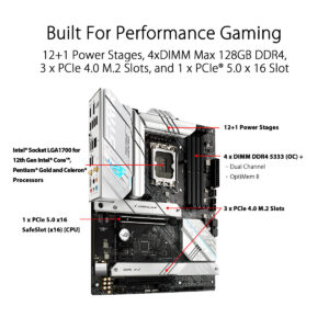 A tecnologia OptiMem II oferece velocidades de relógio mais elevadas através de optimizações de traçado que reduzem significativamente a distância do sinal e o diafragma cruzado ao mesmo tempo que melhoram a estabilidade e compatibilidade da memória. O ROG Strix B660-A Gaming WiFi D4 suporta até 128 GB de memória DDR4 em quatro ranhuras.