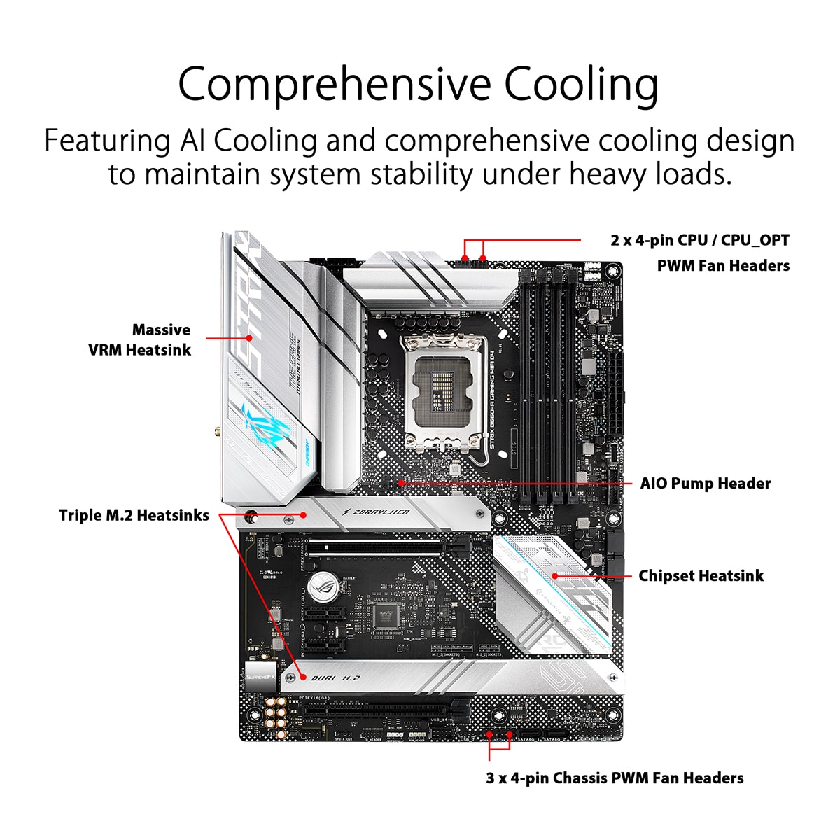 Com três slots M.2 estrategicamente colocados, o ROG Strix B660-A Gaming WiFi D4 aproveita ao máximo a largura de banda da CPU e do chipset para dar suporte a SSDs PCIe 4.0 e a unidades de alta capacidade que ultrapassam o tradicional armazenamento baseado em SATA.