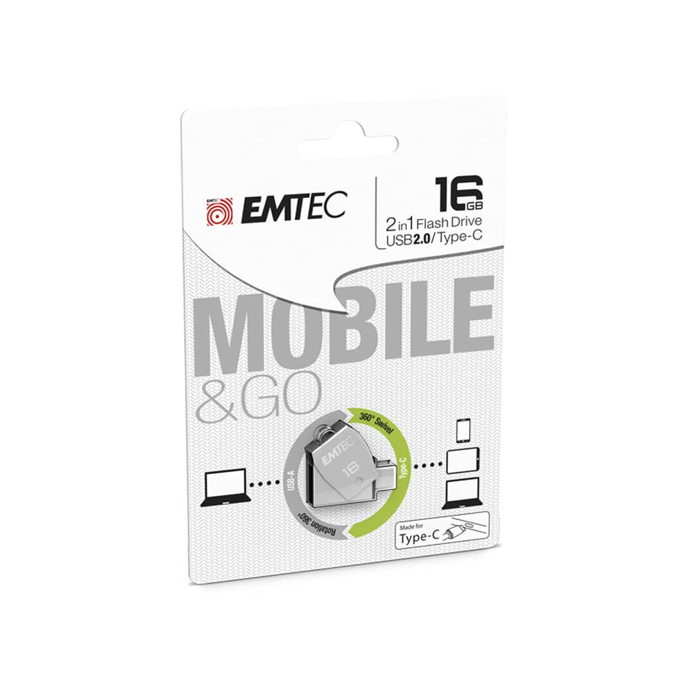 Pen Drive Emtec Dual T250 Usb2.0 + Type-C 16Gb Unidade de metal giratória On-The-Go para armazenar e compartilhar seus documentos com qualquer celular ou computador.